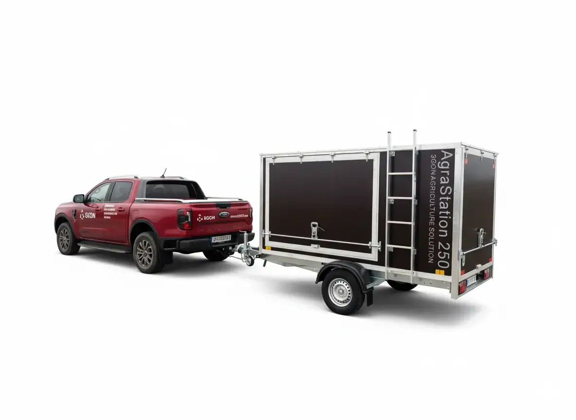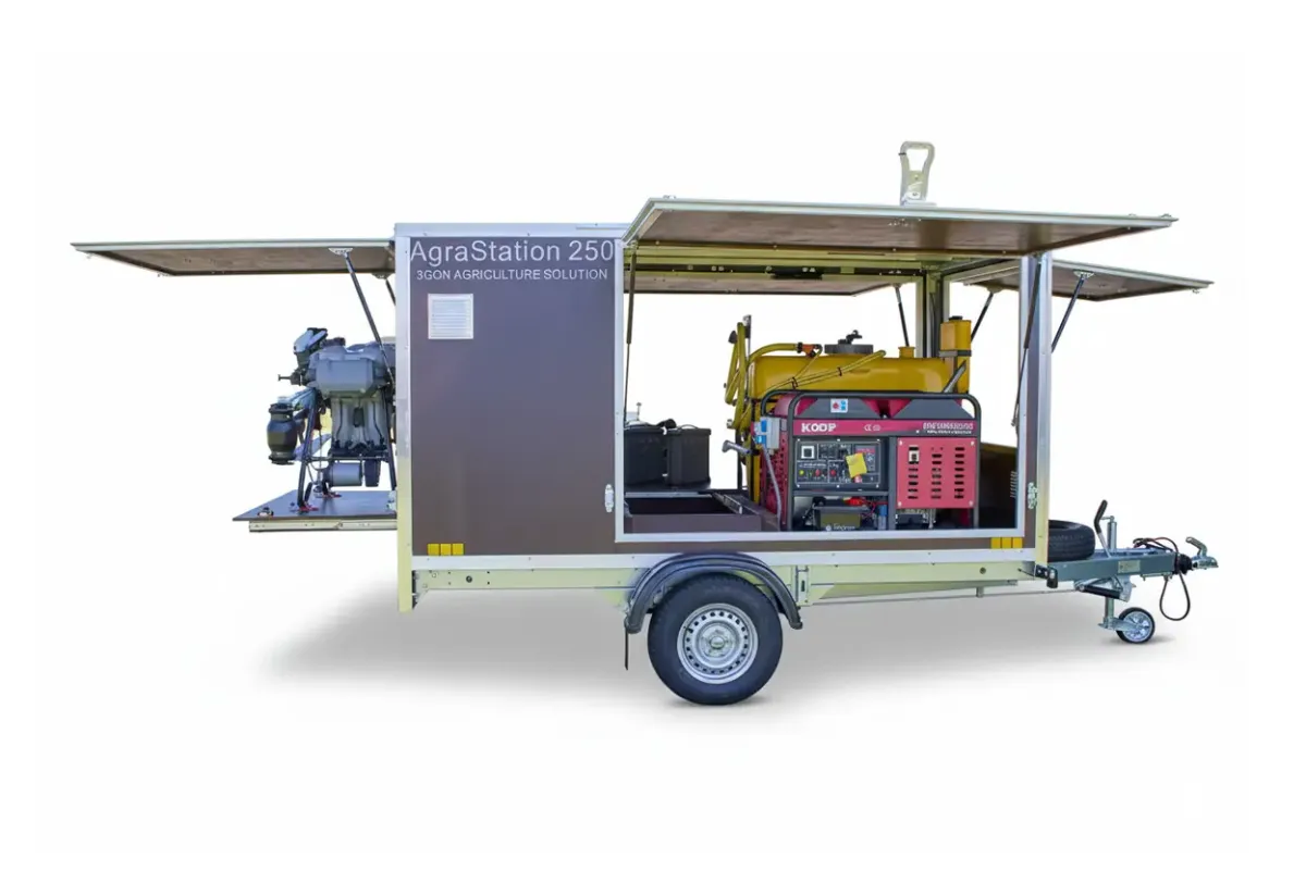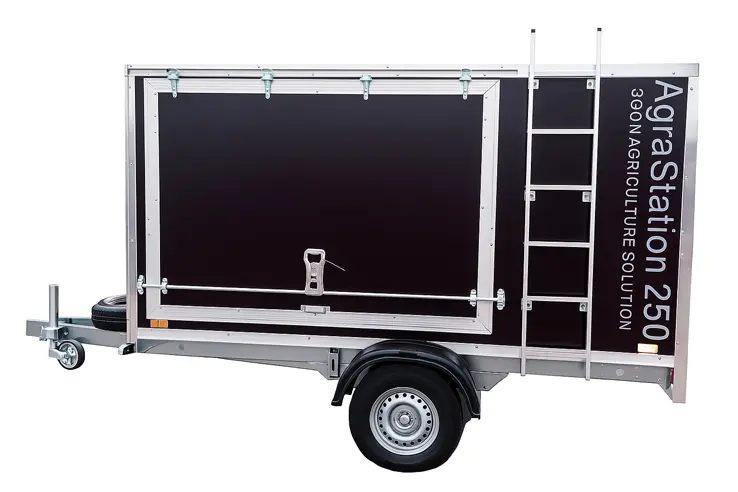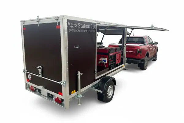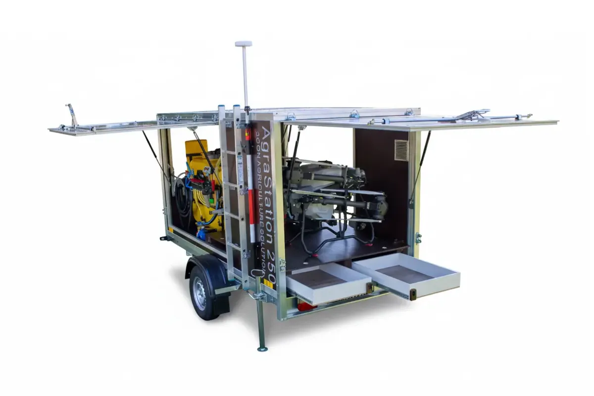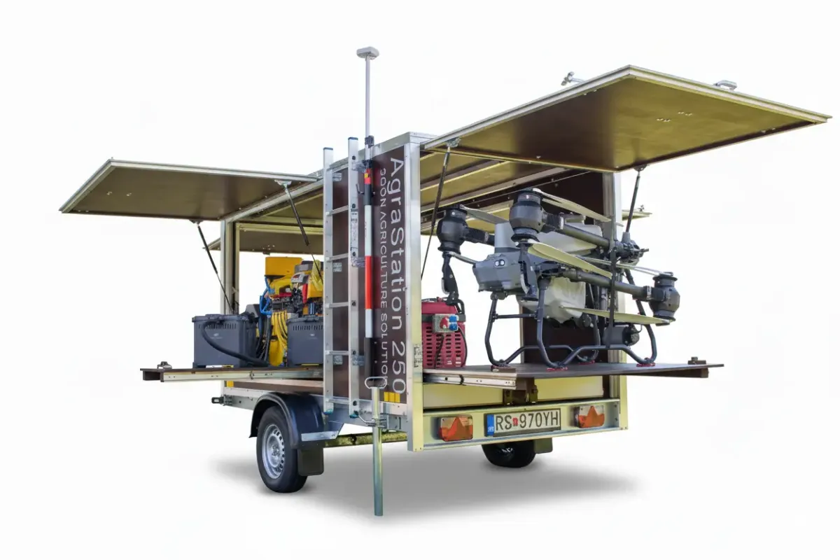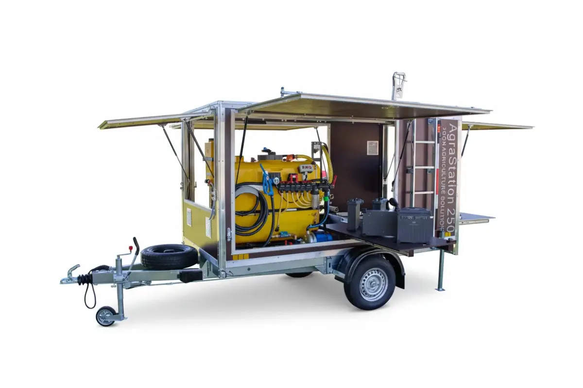Vozík má výsuvný systém pre drony DJI (T30 až T50), výkonný generátor, 300-litrový mixér s certifikovaným vyplachovaním a LED osvetlenie. Robustná konštrukcia a prispôsobenie na mieru zaručujú spoľahlivé využitie v teréne.